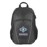 The Tahoma 15” Computer Backpack features a side USB port with cable, padded 15” laptop sleeve and perforated accents. Get extra storage with two side mesh water bottle pockets and a zippered front pocket with organization panel. This backpack also includes a padded back panel, a trolley sleeve and padded, adjustable shoulder straps.