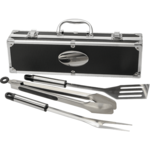 3 piece BBQ set that has everything you need to get grilling! Stainless steel spatula, fork, and tongs all packaged in an aluminum-trimmed carrying case.