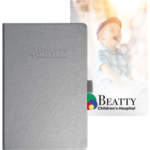 Elevate your brand with this full color, custom bound journal. Features a built in elastic closure, ribbon page marker, document pocket on back cover and 96 sheets of white paper. Customizable full color graphic page insert and blind deboss decoration included in pricing.