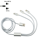 The Realm 3-in-1 Charging Cable comes with USB A tip on one side and a Micro tip, a type C tip, and 2-in-1 dual compatible tip for both Apple iOS and Android devices. It is 47 inches long. Supports charge of 2A current.
