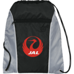 The Funnel Drawstring Bag features an open main compartment with a cinching rope closure. The zippered front pocket even includes an earbud port.