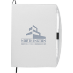The 6" x 7.5" Talbot Notebook is an 80-ruled page, paperback bound notebook with a UltraHyde sleeve cover. It includes a ribbon bookmark and a matching color ballpoint pen with an elastic pen loop. A pen imprints not available.